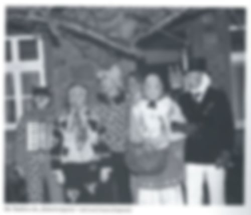 Mittlerweile wurde es nun Mittag und zwei Mann turnten zum Dorf, wo die Gecken mit der Gaffel voll Wurst und `nem Korb voll Eier angekommen waren. Diese zwei mussten sich auch um die Masken bekümmern, und wenn welche zerrissen waren, flicken. Diese zwei hatten ein Anrecht, mit den Gecken zu Mittag zu essen. Und dann bekamen sie für die Alten ein paar Würste und Eier mit, die diese redlich verdient hatten. Nicht selten bekamen die freiwilligen Geldspender ein Stück ab. Dann wurde „Solo“, „Napoleon“ und Skat gespielt. Nicht selten wurde einer an einen anderen Ort gebracht, wo er sich ausruhen konnte und wo ihm nicht auf die Hühneraugen getreten wurde. Man muss wohl bedenken, dass die geleisteten Arbeiten im Zimmern, Ausmessen und Trinken enorm waren und es wohl zu verstehen war, wenn ein müder Krieger vorzeitig abtrat. Es gab doch alte Leute, bei denen dieser Tag einem hohen Feiertag gleichkam, wenn nicht sogar übertrumpfte. Sie trugen extra für diesen Tag ganz besondere und neue Holzschuhe. – Es sind auch Leute gewesen, die an diesem Tag 3x müde wurden, wer kann es ihnen verübeln, wenn sie 3x aussetzen mussten, um die Stärke des Weines zu erproben und dann am Ende doch in die Knie gezwungen wurden. – Das kommt in Köln auch vor, warum dann nicht in Schapen! – Viele kamen neugierig und gingen erfreut oder krochen heim mit trüber Miene. Es gibt wohl keinen Fall, der noch nicht dagewesen wäre, doch stets war alles mit Humor und Spaß begleitet. – Im Laufe der Jahre hat sich so manches, was früher eine wüste Angelegenheit war, verfeinert. Man trank früher den Schnaps aus Biergläsern und halbe Ortspötte, das hat aufgehört. Man hat früher müden Kriegern mit Schuhwichse das Gesicht geschwärzt, sodass sie sich an dem Morgen zu Tode erschraken und die Umstehenden sich wälzten vor Spaß. Im Laufe der Jahre ist die Beteiligung so stark geworden, dass eine große Bauerndiele bald zu klein wurde zum Tanz.
